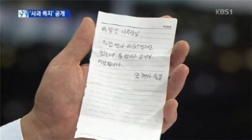 이날 박창진 사무장은 조현아 전 부사장이 남기고 간 사과 쪽지 내용을 공개했다.