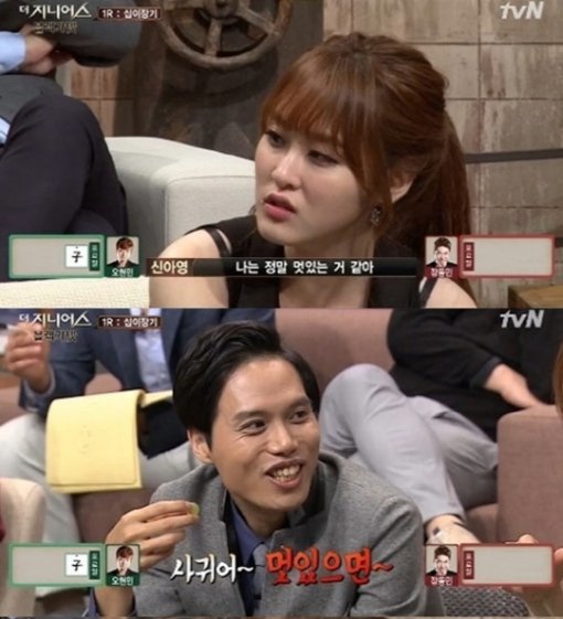 그러나 신아영은 "하지만 장동민이 자기가 불리하다는 걸 알고 계속해서 뭔가를 한다는 게 정말 멋있는 것 같다"고 말해 놀라움을 자아냈다.