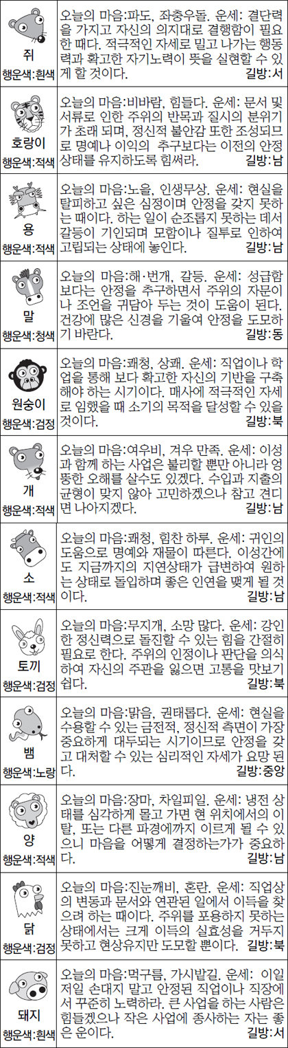 금일복권, 주식, 부동산매입 행운의 띠: 소,뱀,닭(토요일:호랑이,말,개)