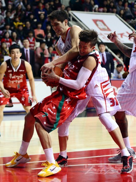 오리온스 장재석(흰색 유니폼)과 KGC 박찬희가 21일 안양체육관에서 열린 2014∼2015 KCC프로농구에서 볼을 차지하기 위해 격렬한 몸싸움을 벌이고 있다. 안양|김민성 기자 marineboy@donga.com 트위터 @bluemarine007