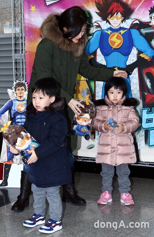배우 이영애가 정승권, 정승빈 쌍둥이 아이들과 23일 오후 서울시 서초구 한전아트센터에서 열린 가족뮤지컬 ‘스페이스 번개맨’에 참석해 포토타임을 하고 있다.