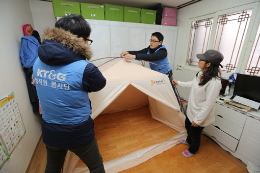 이번 나눔 봉사활동은 내년 1월까지 KT&G 본사 임직원 1인당 저소득가정 1가구에 1개의 난방텐트를 전달하는 방식으로 임직원들이 수혜가정을 직접 방문해 설치를 진행할 예정이다.