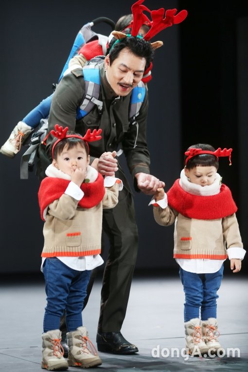 배우 송일국이 24일 오후 서울 강남구 신사동 광림아트센터 BBCH홀에서 열린 연극 '나는 너다' 리허설에서 삼둥이(대한,민국,만세)와 입장하고 있다.