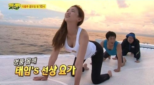 이날 이태임은 몸매가 그대로 드러나는 요가복을 입고 선상에서 요가 시범을 해보였다. 이를 지켜보던 김병만, 류담은 얼굴이 붉어져 웃음을 자아냈다.