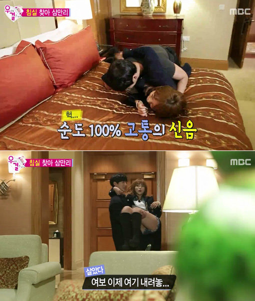 이날 방송에서 남궁민은 호텔 로비부터 방까지 홍진영을 안아 들고 갔다. 남편이 자신을 침대에 던져주는 로망을 가진 홍진영의 요구 때문.