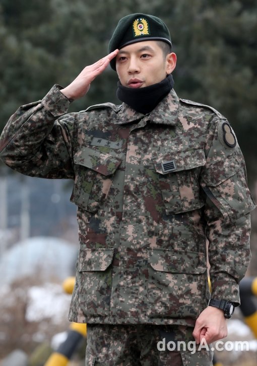 세븐(최동욱)이 28일 오전 경기 포천 8사단 앞에서 취재진과 팬들에게 전역 인사를 하고 있다.