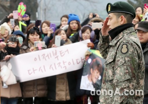 세븐(최동욱)이 28일 오전 경기 포천 8사단 앞에서 취재진과 팬들에게 전역 인사를 하고 있다.