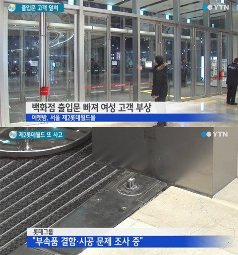 롯데그룹 등에 따르면 지난 27일 오후 6시쯤 잠실역 11번 출구 인근으로 난 제2롯데월드몰 1층 왼쪽 출입문 가운데 하나가 분리돼 쇼핑몰을 나가던 정모(25·여) 씨 뒤로 문이 쓰러져 머리와 어깨 부분이 깔렸다.