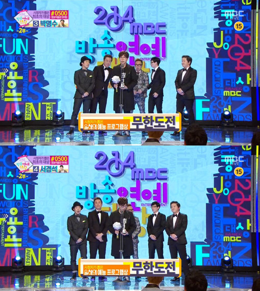 ‘무한도전’ 팀은 29일 오후 서울 마포구 상암동 MBC 미디어센터에서 열린 ‘2014 MBC 방송연예대상’ 시상식에서 올해의 예능프로그램상 수상자로 호명됐다. 단상에는 연출자 김태호 PD를 비롯해 ‘무한도전’ 다섯 멤버 전원이 올랐다.