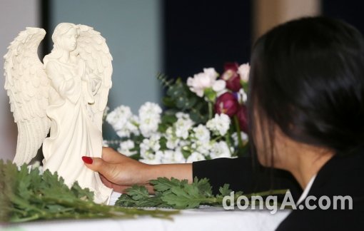 가수 유리가 고인의 넋을 위로하며 천사 모양의 유골을 만지고 있다. 유리는 고인과 같은 시기에 활동했다. 故 죠앤(26. 이연지)은 지난 11월 26일 미국에서 교통사고를 당해 혼수상태에 빠졌고 12월 2일 사망했다.