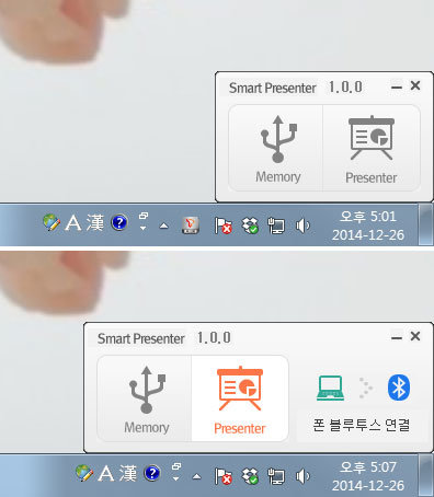프로그램 설치 후, 제품을 사용하려면 PC에 USB를 다시 꼽으면 된다. 그러면 PC화면 오른쪽 하단에 ‘스마트 프리젠터 1.0’이 인식될 것이다. 스마트 하이브리드 USB의 기능은 메모리, 프리젠터 등 2가지다. 프레젠테이션 기능을 하려면, ‘프리젠터’ 기능을 선택하면 된다. 또한, 휴대폰과 연결이 되면 블루투스 연결이 되었다는 신호가 나타나며, 마우스 포인터가 화살표 모양으로 바뀐다.