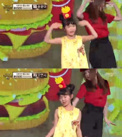 아역 배우 김지영이 머리에 감자튀김을 얹고 깜찍한 특별공연을 펼쳤다.