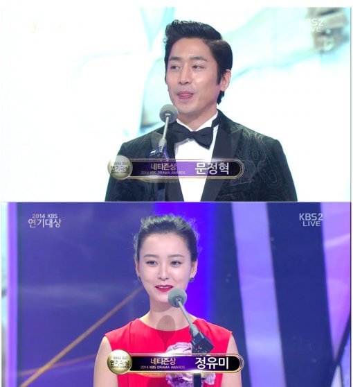 문정혁과 정유미는 31일 오후 8시 30분부터 서울 여의도 KBS홀에서 열린 ‘2014 KBS 연기대상’에서 네티즌상을 수상했다.