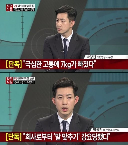 앞서 박창진 사무장은 지난해 12월 30일 채널A ‘직언직설’에 출연해 “최근 사건 이후 몸무게가 7kg이나 빠졌고 환청에 시달리는 등 공황장애 증상을 겪고 있다”고 털어놨다.