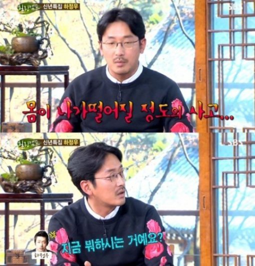 하정우는 “걸어서 퇴근을 하는데 차에 치었다. 차를 나를 치고 도망을 가더라. 억압과 울분이 올라오던 확 올라왔다”라며 “그 당시 영화 ‘베를린’을 찍은 후라서 체력 상태가 좋았다. ‘내가 오늘 널 잡는다’라는 생각 뿐이었다”라고 뺑소니범과 추격전을 벌였다고 전했다.