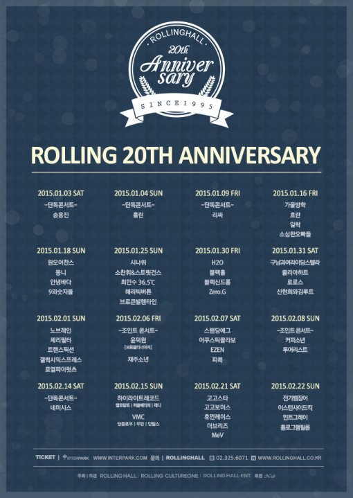 롤링홀 20주년 기념 공연은 지난 3일 송용진 단독공연으로 시작해 다음달 22일 전기뱀장어-이스턴사이드킥-민트그레이-홀로그램필름의 공연으로 막을 내린다. 16일간 인디와 메이저, 신예와 베테랑 뮤지션 등 총 60여 팀이 무대에 오른다.