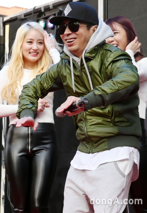 남성 듀오 전멤버 김정남이 10일 오후 서울 종로구 대학로에서 열린 걸그룹 타히티 게릴라 윙카 버스킹에서 화려한 댄스를 선보이고 있다.