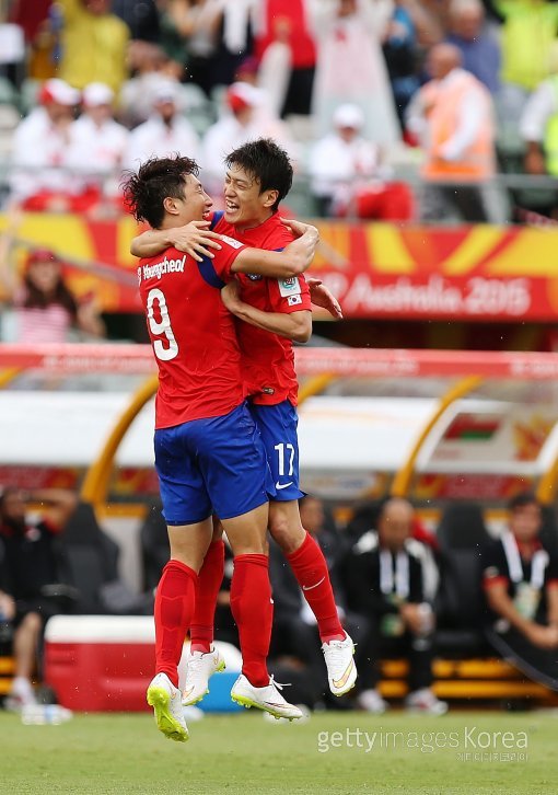 10일(이하 한국시간) 호주 캔버라 스타디움에서 열린 2015 아시아축구연맹(AFC) 아시안컵 축구 조별리그 A조 한국-오만 경기. 조영철(왼쪽·카타르SC)이 전반 추가시간 때 선제골을 넣은 뒤 이청용(볼턴)과 함께 기쁨을 나누고 있다.