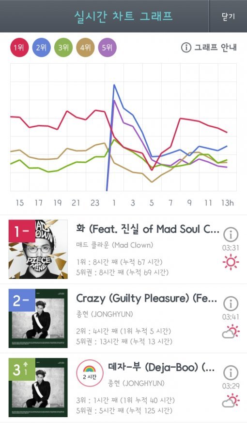 KT뮤직 지니 관계자는 "매드 클라운과 종현의 음원이 실시간 차트 상위권 경쟁이 치열했다”며 "강렬하고 개성있는 신곡들에 네티즌들의 관심이 쏠리고 있다”고 말했다.