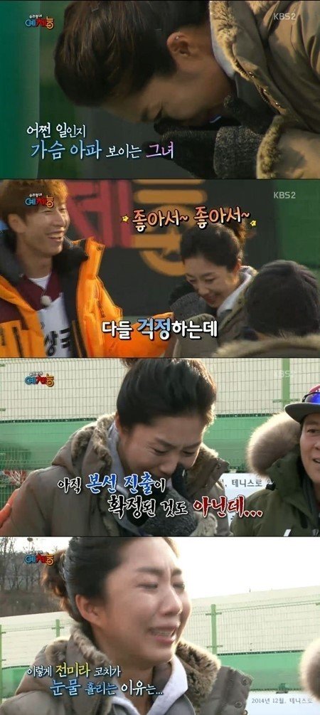 전미라가 한 예능 방송에서 성혁, 이광용이 경기도 팀과의 테니스 경기에서 승리하자 눈물을 흘리는 장면이 포착돼 누리꾼들의 눈물샘까지 자극하고 있다.