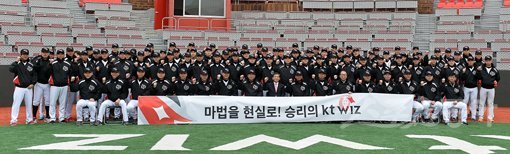 kt 위즈 선수단이 14일 수원구장에서 열린 시무식에서 2015년 힘찬 출발을 다짐하고 있다. 조범현 감독은 이날 시무식에서 “어떤 어려운 일을 만나더라도 우리 함께 극복하자”며 “모든 것을 다 모아 집중하면 놀랄 만한 성과를 얻을 수 있다”고 강조했다. kt는 16일 일본 미야자키와 가고시마로 스프링캠프를 떠난다. 수원|임민환 기자 minani84@donga.com 트위터 @minani84