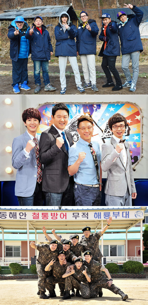 KBS 2TV ‘1박2일’과 MBC ‘라디오 스타’·‘진짜 사나이’(맨 위 사진부터)는 남자 연예인들이 이끄는 대표적인 예능프로그램이다. 사진제공|KBS·MBC
