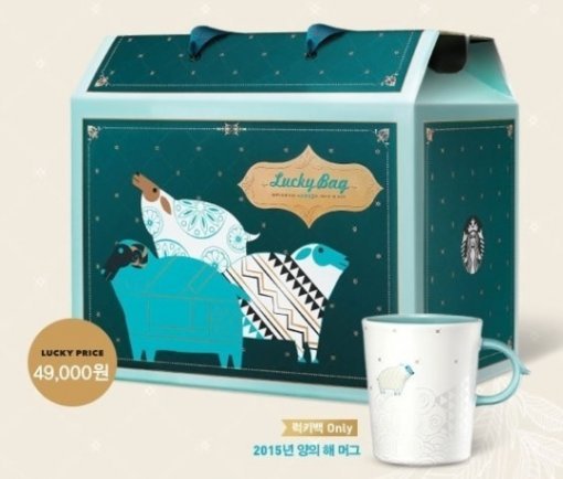 '2015 스타벅스 럭키백'은 고객이 가장 선호하는 스테인리스 스틸 텀블러를 포함해 플라스틱 텀블러, 머그 등 제품이 포함된 구성으로 40여 가지 다양한 종류로 준비됐다. 일부 럭키백에 한해 머들러와 컵받침이 추가 제공되며 스타벅스 무료 음료 쿠폰도 최대 7매가 포함돼 있다. 특히 청양의 해를 맞이해 특별 기획·제작된 '청양 머그'가 담겨 있다.