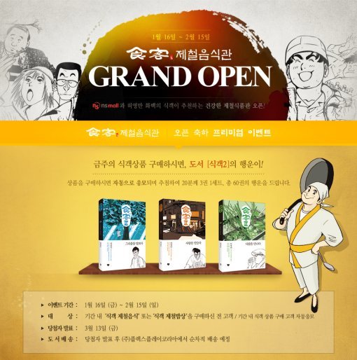 NS몰은 ‘NS 식객 제철음식관’ 오픈 기념으로 구매고객 중 응모자를 대상으로 허영만 화백의 ‘식객II(3권·1세트)’를 증정하는 이벤트도 준비했다. 응모기간은 2월 15일까지이며 추첨을 통해 총 20명에게 증정한다. 당첨자 발표는 3월 13일 NS몰 게시판에서 한다.