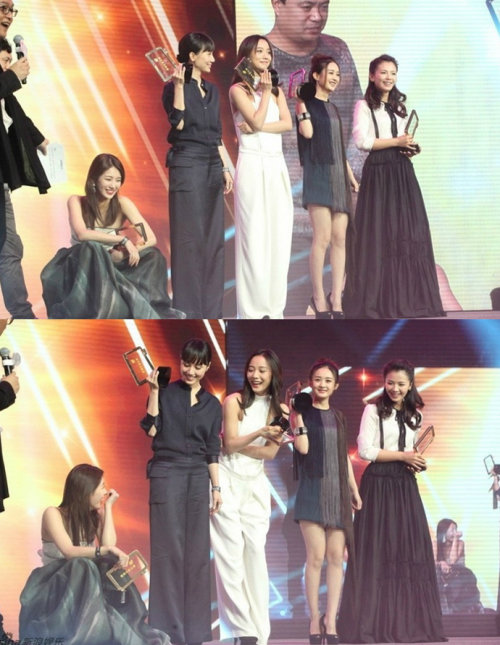 이날 시나닷컴 등의 현지매체가 공개한 시상식 사진에서 수지는 홀로 쭈그려 앉아있는데 이는 사회자가 스타들에게 ‘터프걸’ 자세를 취해 달라고 요구했기 때문이다.