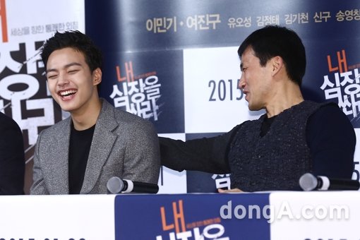 배우 여진구(왼쪽), 유오성이 20일 오후 서울시 광진구 건대입구 롯데시네마에서 열린 영화 ‘내 심장을 쏴라’ 언론시사회에서 환하게 웃고 있다.