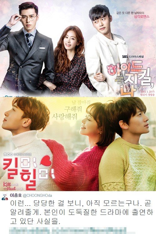 이어 “같은 시간대 다중인격을 소재로 한 드라마가 방송되는 점은 안타깝다”며 “유행이라는 게 있지만 드라마도 다양성을 지녔으면 좋겠다”고 발언했다. 이는 '킬미 힐미'와 SBS 수목드라마 ‘하이드 지킬, 나’가 동시간대에 방송되는 것을 뜻하는 것으로 보인다.