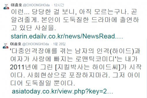 이충호 작가는 자신의 트위터를 통해 21일 “다중인격장애를 겪는 남자의 인격(하이드)과 여자가 사랑에 빠지는 로맨틱코미디는 내가 2011년에 그린 '지킬박사는 하이드씨'가 시작이다. 사회현상으로 포장하지 말고 그저 아이디어 도둑질일 뿐이다. 이런. 당당한 걸 보니, 아직 모르는구나. 곧 알려줄게. 본인이 도둑질한 드라마에 출연하고 있단 사실을”이라며 기사를 링크했다.