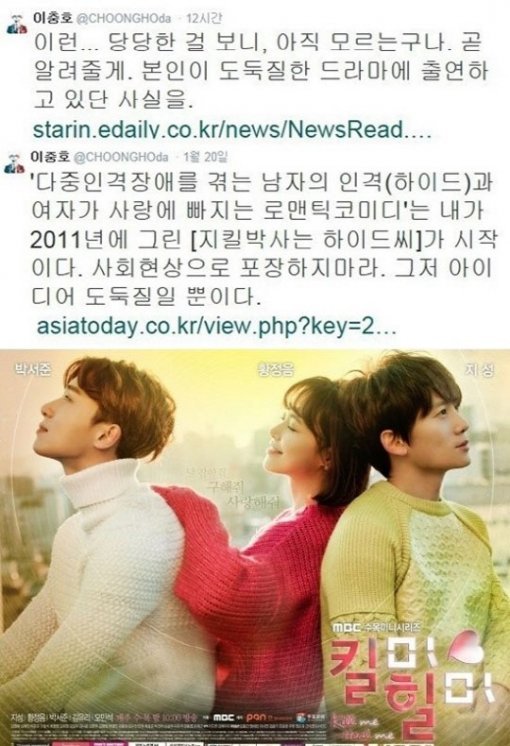이충호 작가가 MBC 드라마 '킬미힐미'를 비난해 표절 논란이 일었다.