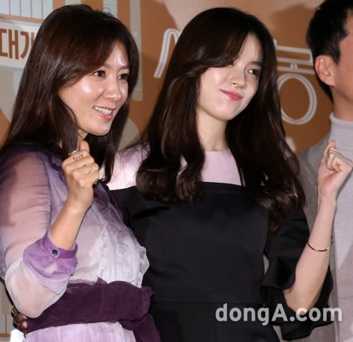 배우 김희애(왼쪽)와 한효주가 22일 오후서울 성동구 왕십리CGV에서 열린 영화 '쎄시봉' 언론시사회에서 포토타임을 하고 있다.