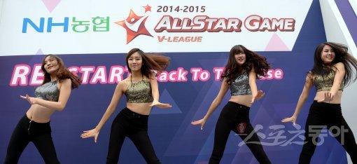 25일 오후 서울 장충체육관에서 열린 ‘2014-2015 NH농협 V리그 프로배구 올스타전’ 레드카펫 무대에서 치어리더들이 공연을 펼치고 있다. 이번 올스타전은 재개장된 배구의 메카 장충체육관에서 열렸으며 팬들을 위한 풍성한 이벤트가 준비됐다.