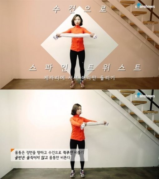 수건을 이용한 운동법은 수건 한 장을 양손으로 잡고 팔을 위로 쭊 올려 전신을 늘려주는 스트레칭으로 몸을 푼다.
