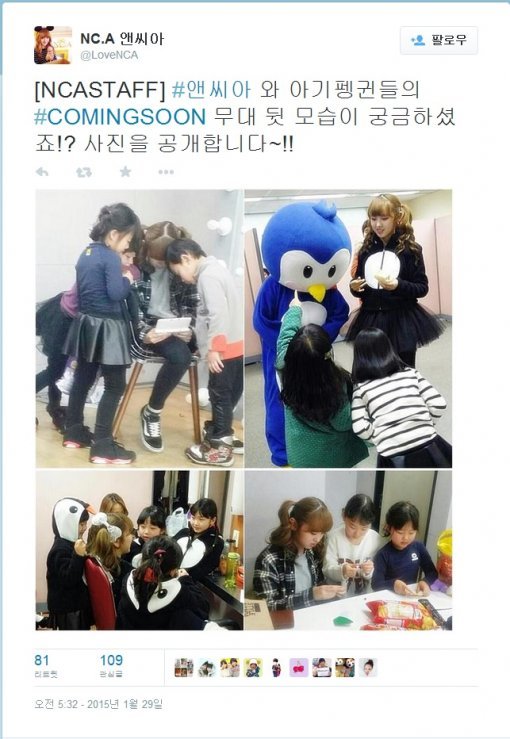 “앤씨아와 아기펭귄들의 ‘커밍 순’ 무대 뒷모습이 궁금하셨죠?”라며 공개한 사진에서 앤씨아’는 아이들과 어울려 종이접기도 하고, 게임도 하며 함께 다정한 언니로 아이들과 스스럼없이 어울리고 있다.
