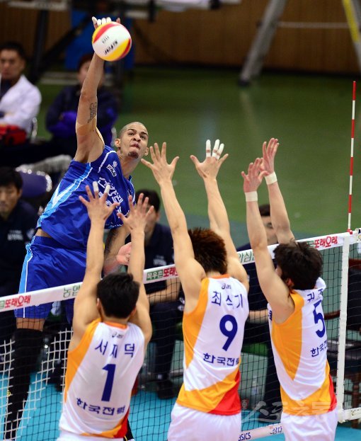 1일 수원실내체육관에서 열린 ‘NH농협 2014-2015 V리그’ 남자부 한국전력 대 삼성화재 경기에서 삼성화재 레오가 한국전력의 블로킹 사이로 스파이크 공격을 하고 있다.