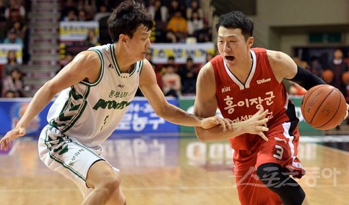 KGC 이정현(오른쪽)이 1일 안양체육관에서 벌어진 동부와의 홈경기 도중 허웅의 마크를 피해 돌파를 시도하고 있다. 안양|임민환 기자 minani84@donga.com 트위터 @minana84
