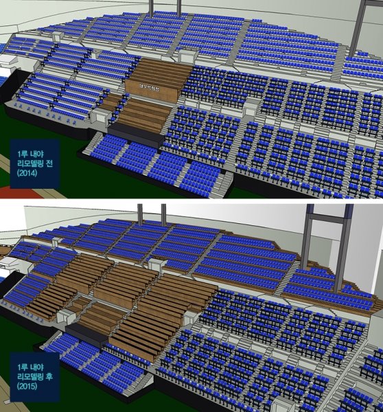 대신 1루 내야석 1~2층에 나무 데크 바닥을 넓히고 가죽쿠션과 등받이, 간이 테이블을 새로 넣어 편하게 야구를 볼 수 있도록 만들었다. 3층에는 기존 좌석과 시멘트 구조물 사이 발판을 붙여 가파른 경사를 줄였다.