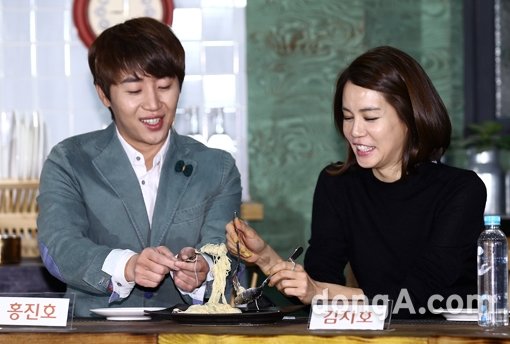 홍진호(왼쪽), 김지호가 2일 오후 서울 강서구 CJ E&M 가양동 스튜디오에서 열린 ‘올리브 쇼 2015’오픈 스튜디오 행사에서 시식을 하고 있다.