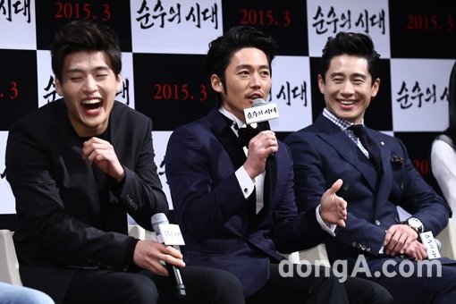 배우 강하늘(왼쪽부터), 장혁, 신하균이 3일 오전 서울 강남구 압구정CGV에서 열린 영화 ‘순수의 시대’ 제작보고회에서 기자간담회를 하고 있다.