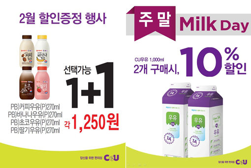 CU(씨유)가 2월 한 달간 흰우유, 가공유, 발효유 등을 포함한 유제품 50여 가지 품목에 대해 ‘+1 증정행사’를 진행한다.