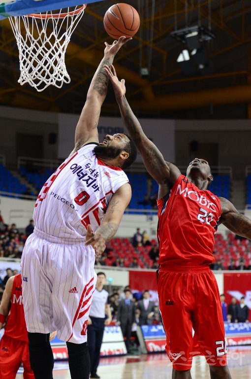 3일 울산동천체육관에서 열린 2014-2015 프로농구 울산모비스 고양오리온스 경기에서 울산모비스 라틀리프와 고양오리온스 길렌워터가 리바운드 볼을 다투고 있다.