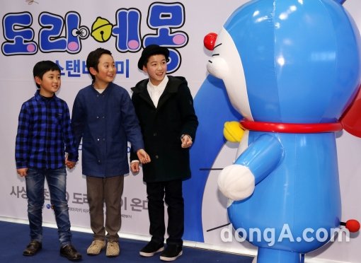 아역 배우 전혁석, 노강민, 남다름(왼쪽부터)이 3일 오후 서울 강남구 코엑스메가박스에서 열린 에니메이션 '도라에몽: 스탠바이미' 세대공감 특별시사회에 앞서 포토타임을 하고 있다.