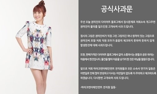 권미진의 소속사 마이크엔터테인먼트는 전날 공식 홈페이지를 통해 “권미진의 다이어트 블로그에서 접시 문제로 저희 소속 개그우먼 권미진이 물의를 일으킨 점 고개 숙여 사과 드립니다”라고 전했다.