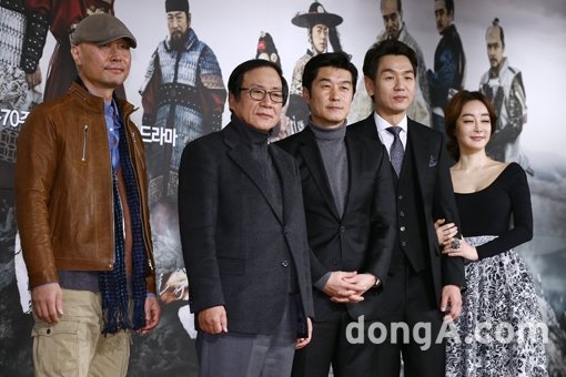 배우 이재용(왼쪽부터), 임동진, 김상중, 김태우, 김혜은이 5일 오후 서울 영등포구 63컨벤션센터에서 열린 KBS 새 주말드라마 ‘징비록’ 제작발표회에서 포토타임을 하고 있다.