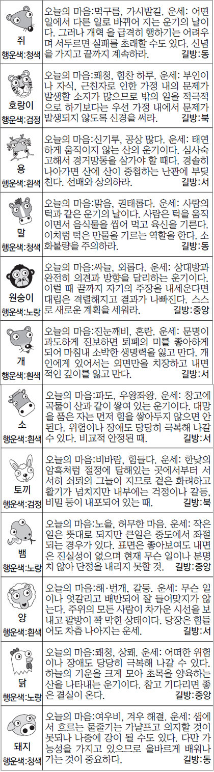 금일복권, 주식, 부동산매입 행운의 띠: 호랑이,말,개(토요일:토끼,양,돼지)