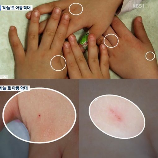어린이집 바늘 학대의 피해자는 A 양만이 아니었다. 이날 보도에 따르면 문제의 어린이집에 다니는 어린이 10여 명의 팔과 다리 등에서 바늘로 찔린 흔적이 발견됐다.