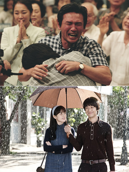 화제작이었던 ‘쎄시봉’(아래쪽 사진)은 기대이하의 흥행으로 울상이다. 반면 작년 12월 개봉한 ‘국제시장’(위쪽 사진)은 흥행세를 이어가면서 한국영화 역대흥행 2위까지 올랐다. 사진제공|JK픽쳐스·제이필름